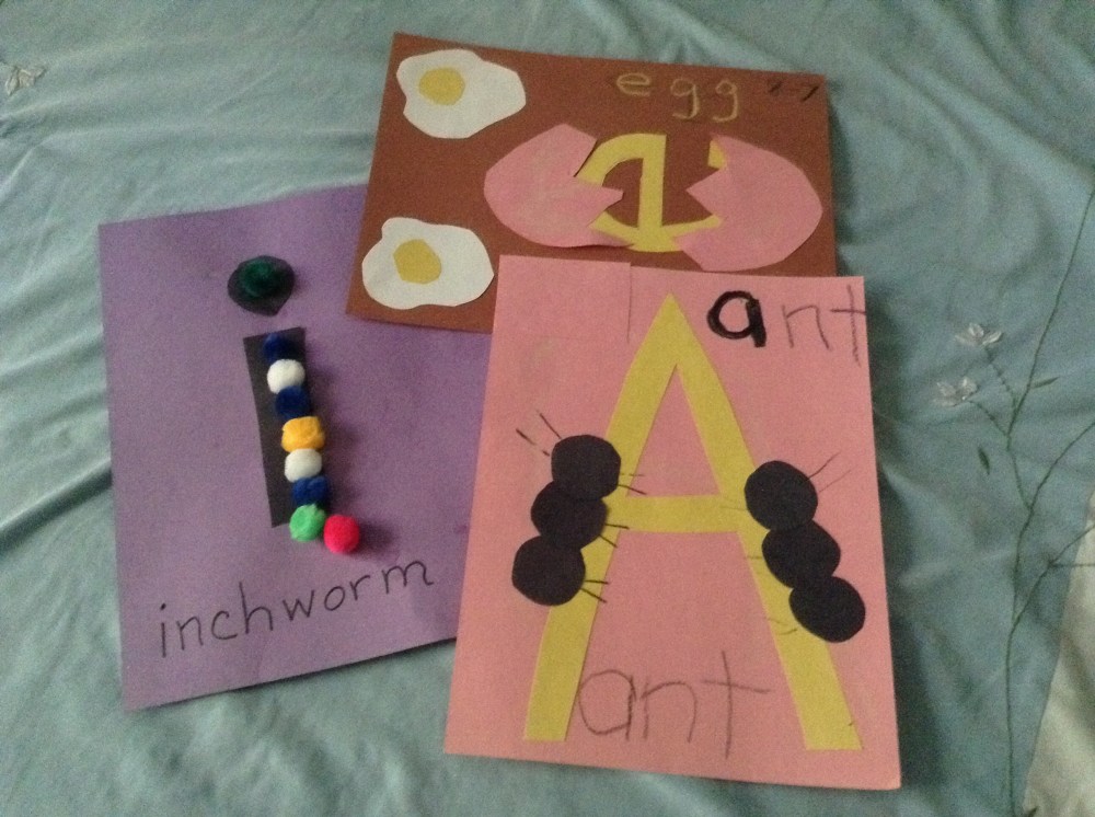 Crafts that visually match the letter with the short vowel sound are fun ways to help the grands learn. Their mom displays their crafts in their room, so they see these every day.