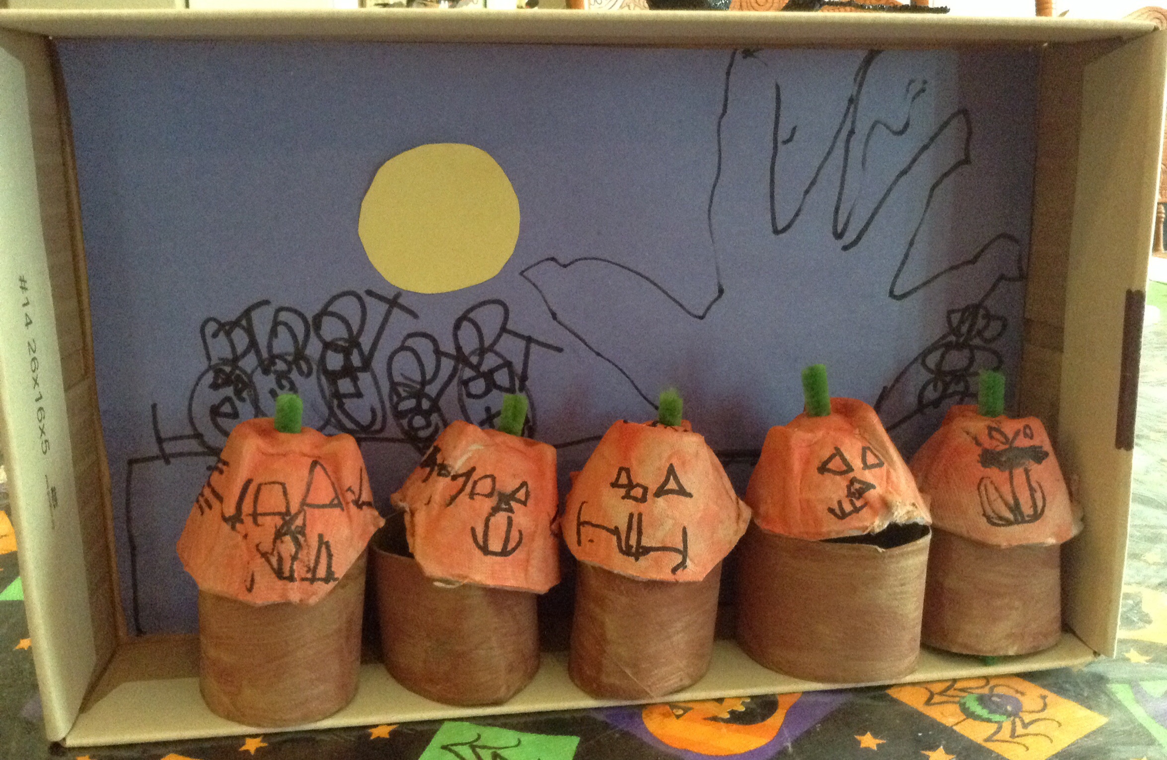 All the grands helped make the diorama. Tigger drew pumpkin faces and the scary background. Tahoe glued the background to the shoebox lid.