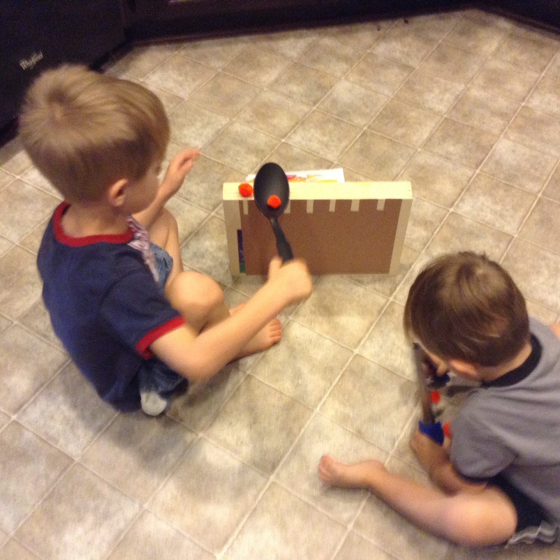 Tahoe and Kona enjoyed putting the pom poms on the box using kitchen utensils.