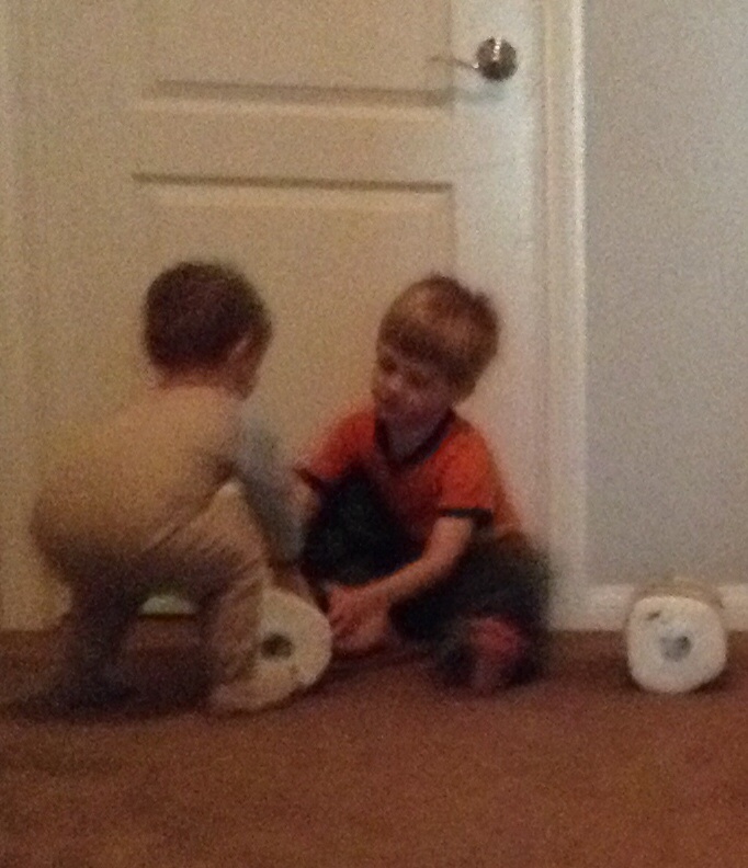 Tahoe picks up a “log” from a stack of paper towel rolls that Kona built.