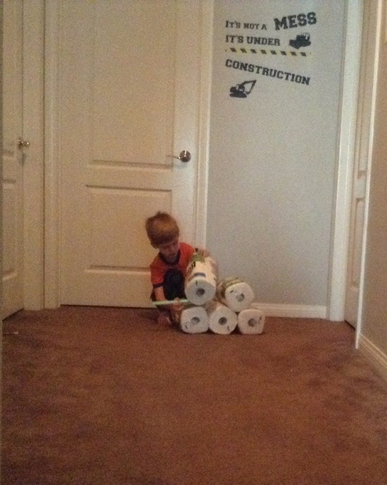 Kona stacked up paper towel rolls to represent a pile of logs.