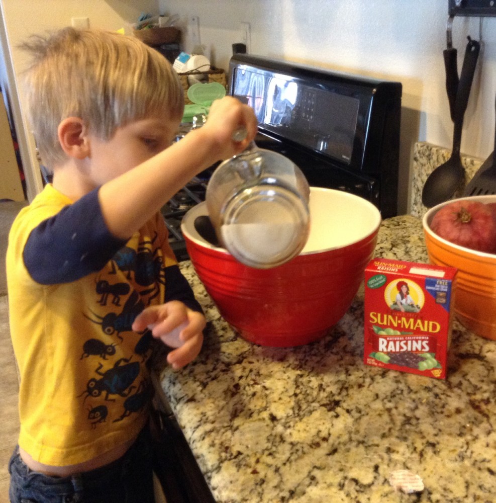 Kona is careful when measuring and pouring the milk.