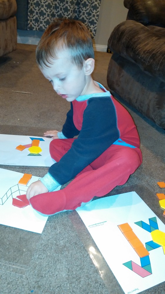 Tahoe was eager to use his pattern blocks on pre-made mats to make Nativity scenes.