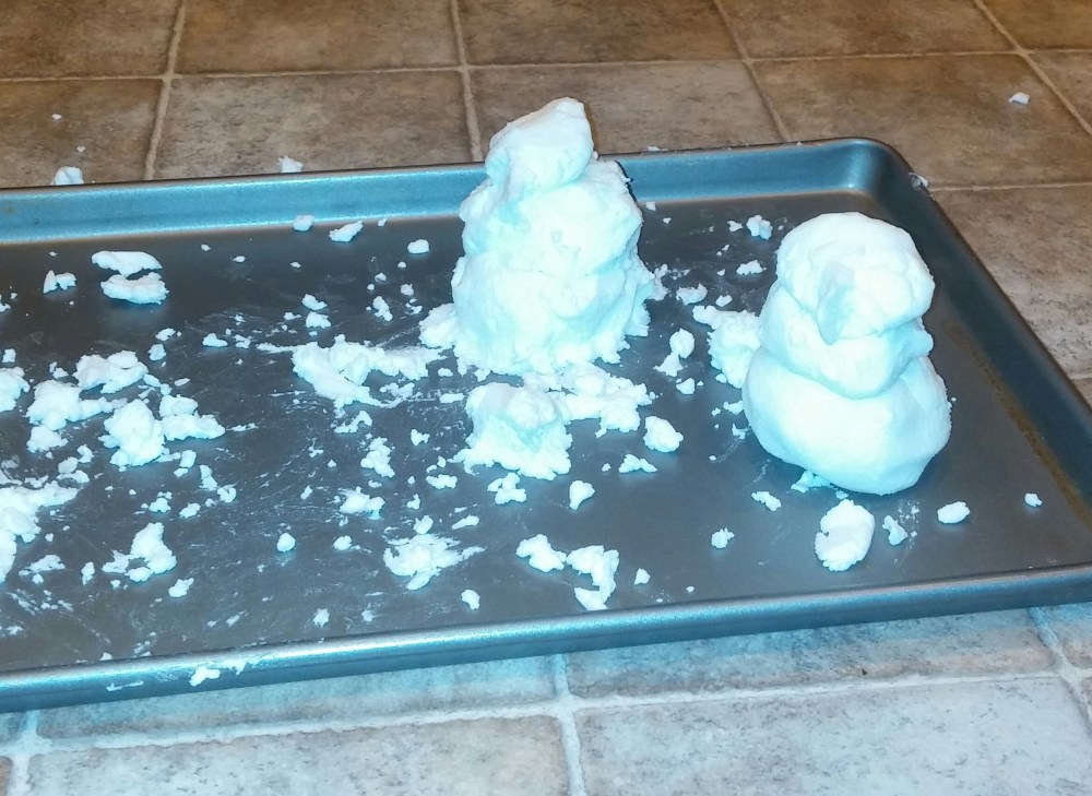I had him work with the “pretend snow” on a cookie sheet in the kitchen floor to make it easier to clean up afterwards. He made two snowmen.