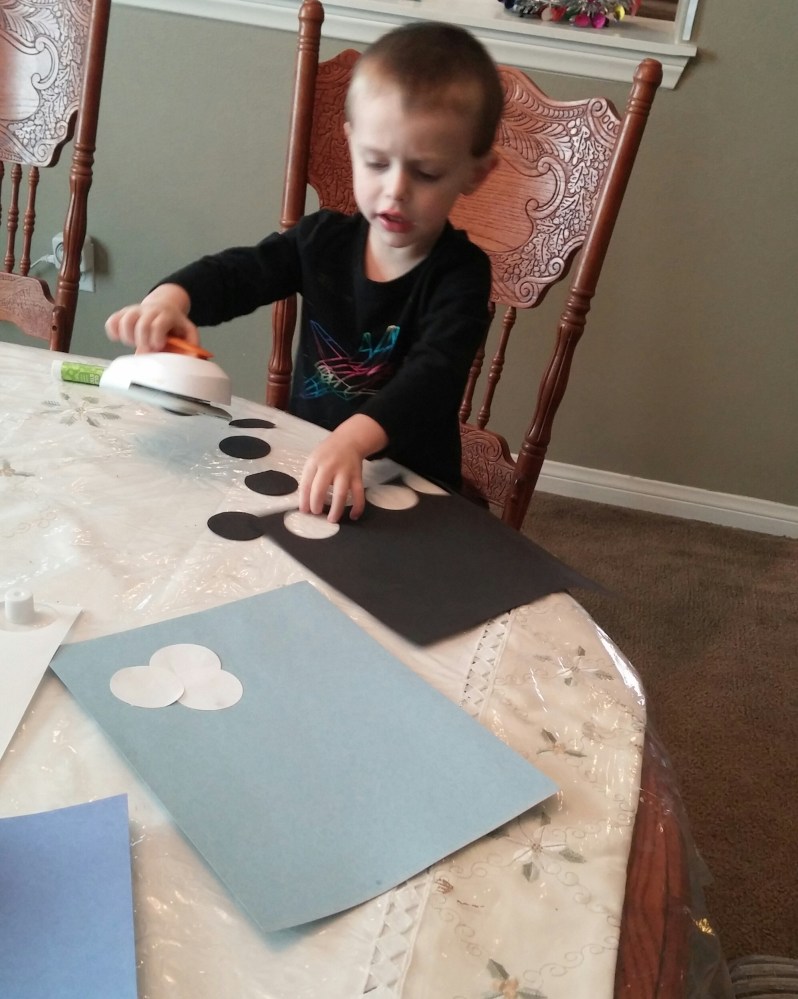 Tahoe punches out circles to make his picture.