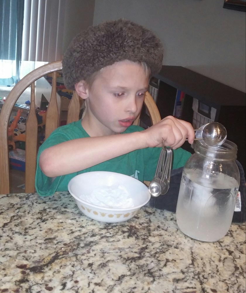 Tigger adds nine tablespoons of borax to boiling water as part of his “snowflake ” activity.