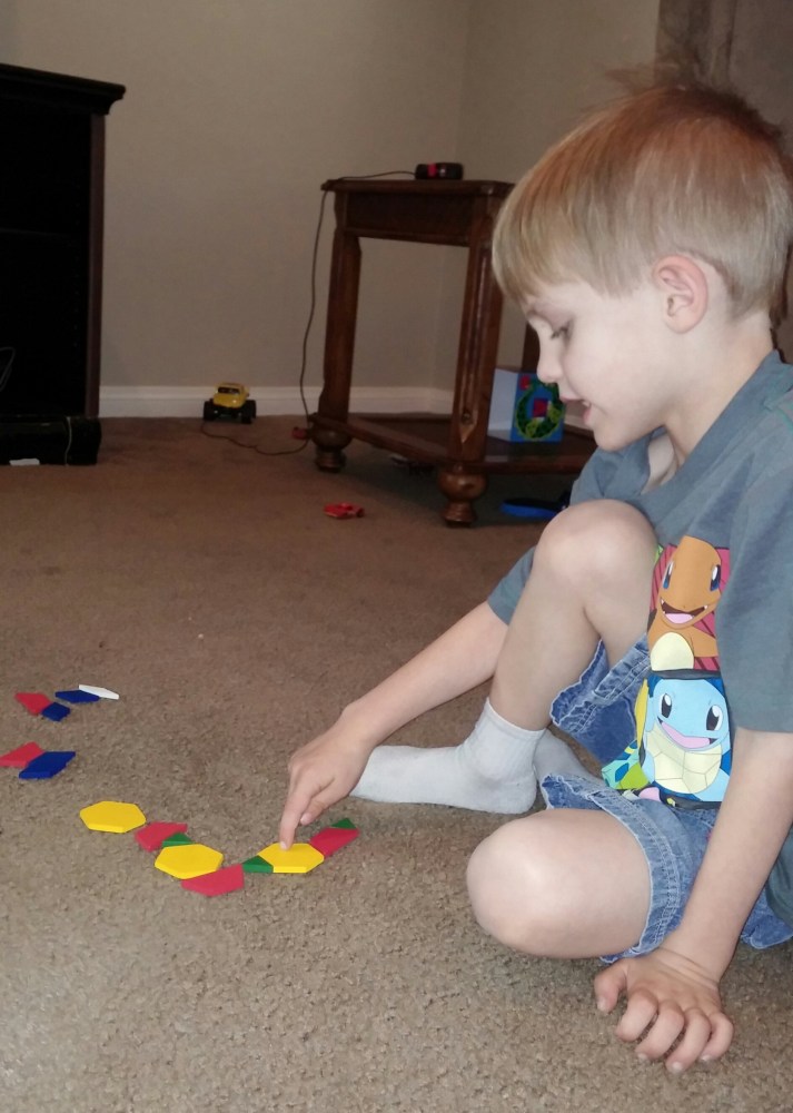 Making a capital L with pattern blocks works on both geometry and number sense skills.