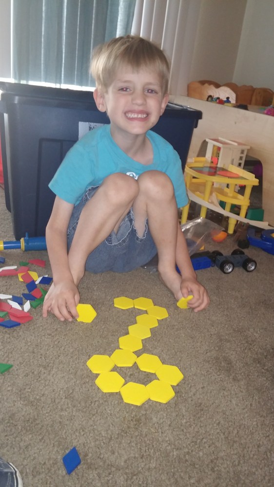 Kona made a lowercase “q” out of hexagon pattern blocks.
