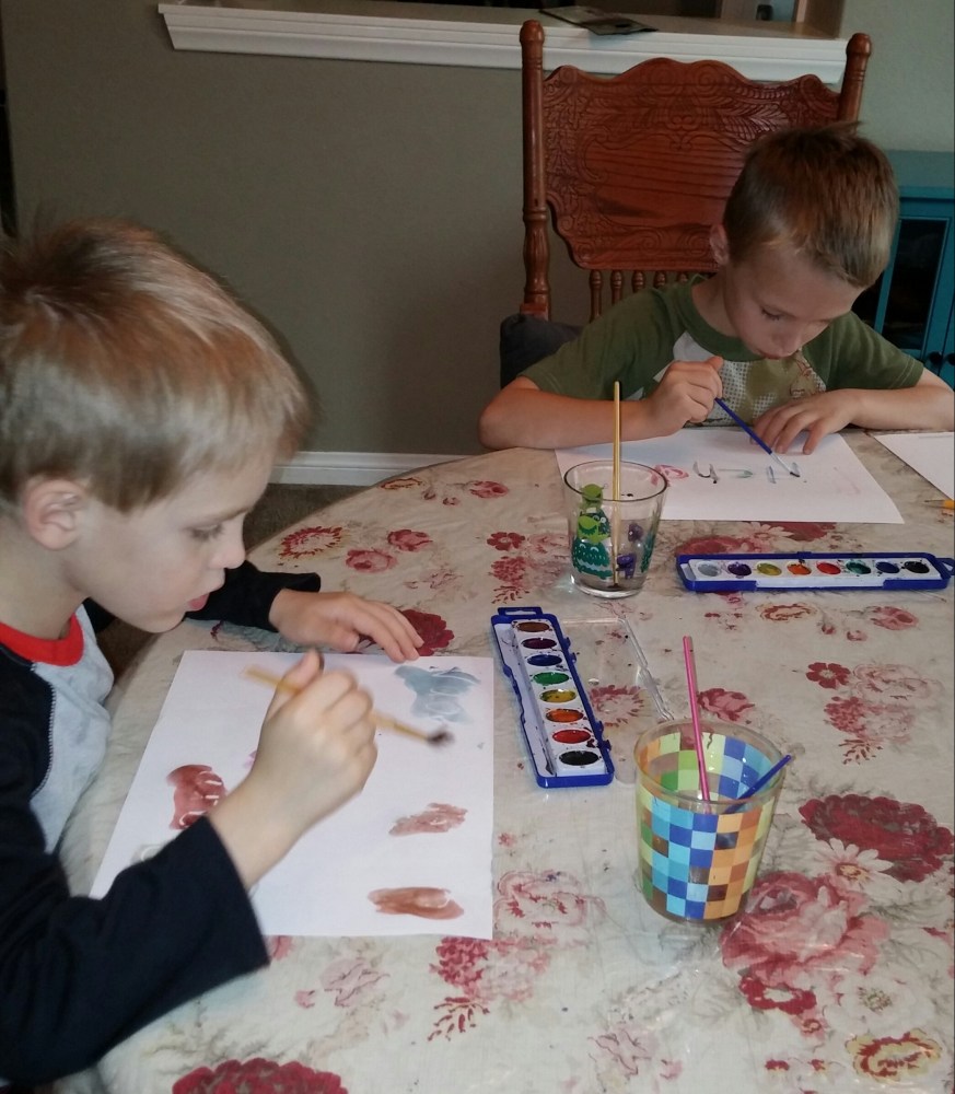 Tigger, 7, and Kona, 5, use their watercolors to reveal the “secret” message about the day’s Bible lesson.