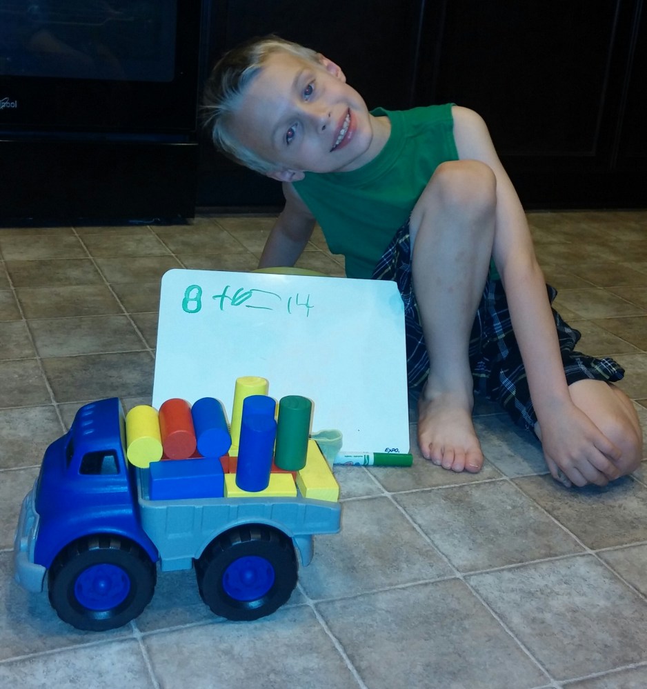 After adding the six blocks to his toy truck, Tigger finished the equation.