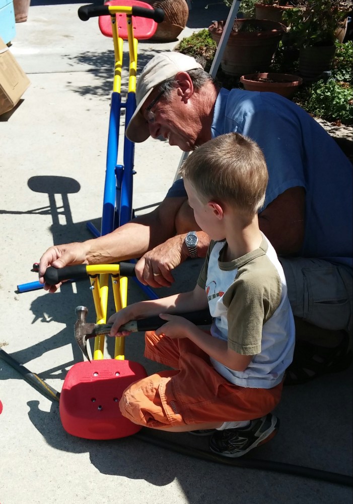 Grandpa Jim and Tigger work together to put together a seesaw for our backyard.