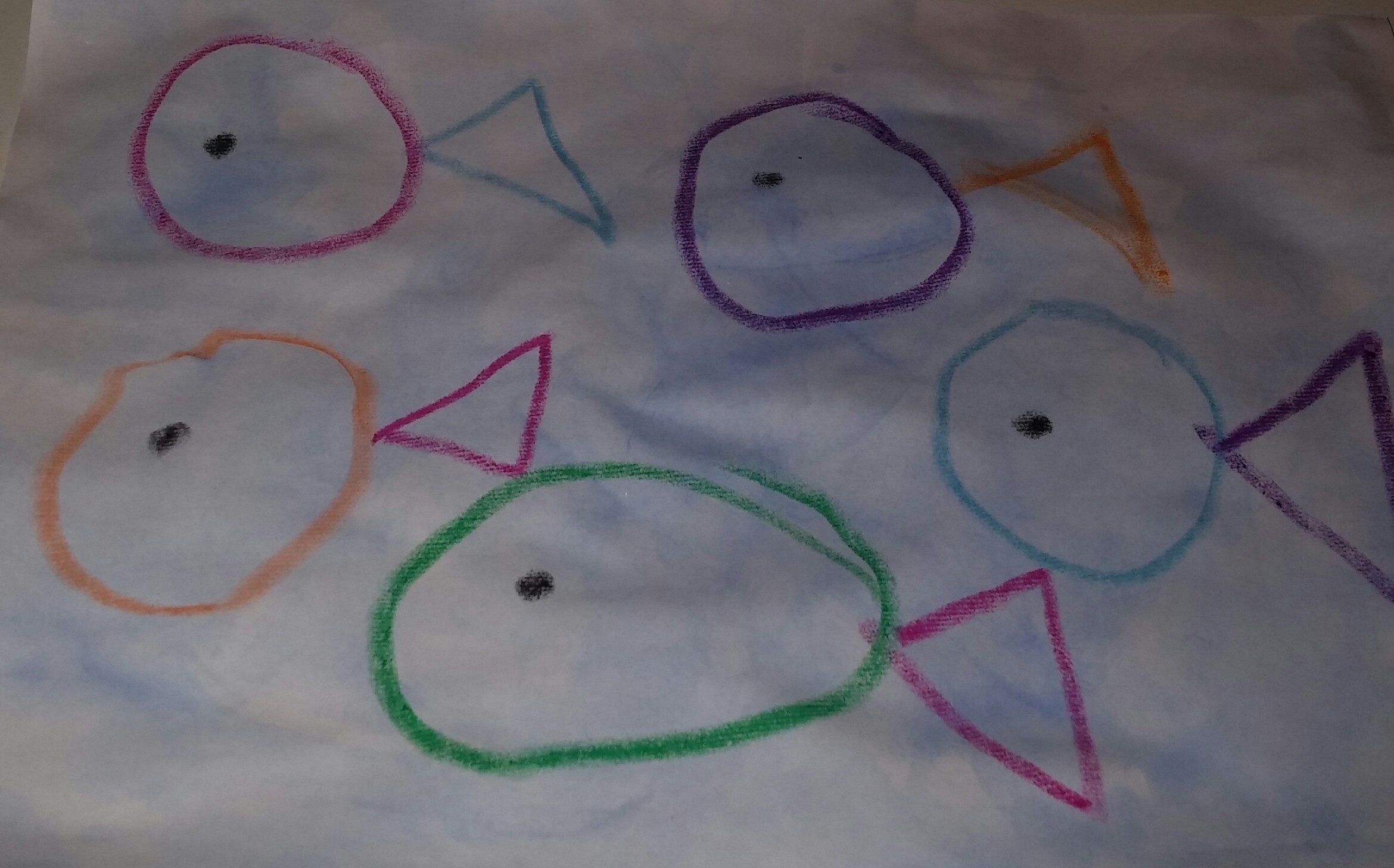 This is Tahoe’s finished project using triangles and circles to draw fish with crayons. He brushed on a diluted blue paint to create the ocean feel.