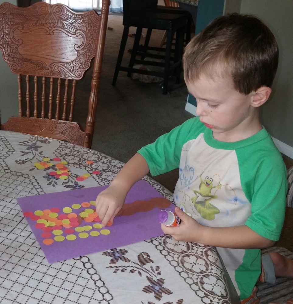 Another autumn tree craft was made using circles I punched out for Tahoe. My 3 year old grandson used the larger brown circles to make a tree trunk.