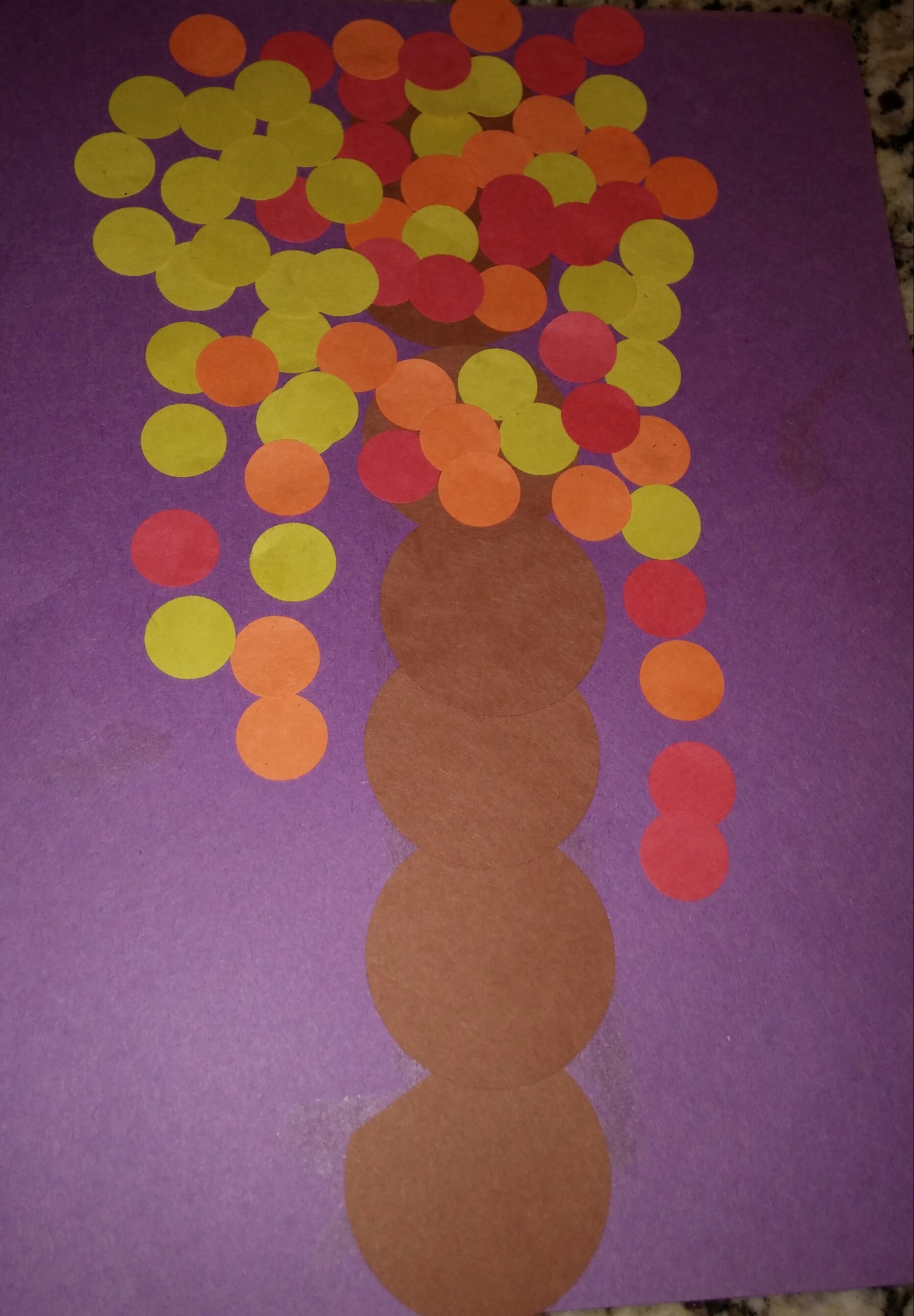 Then he used a glue stick to place all the smaller circles as leaves. Can you see the leaves falling from the tree?