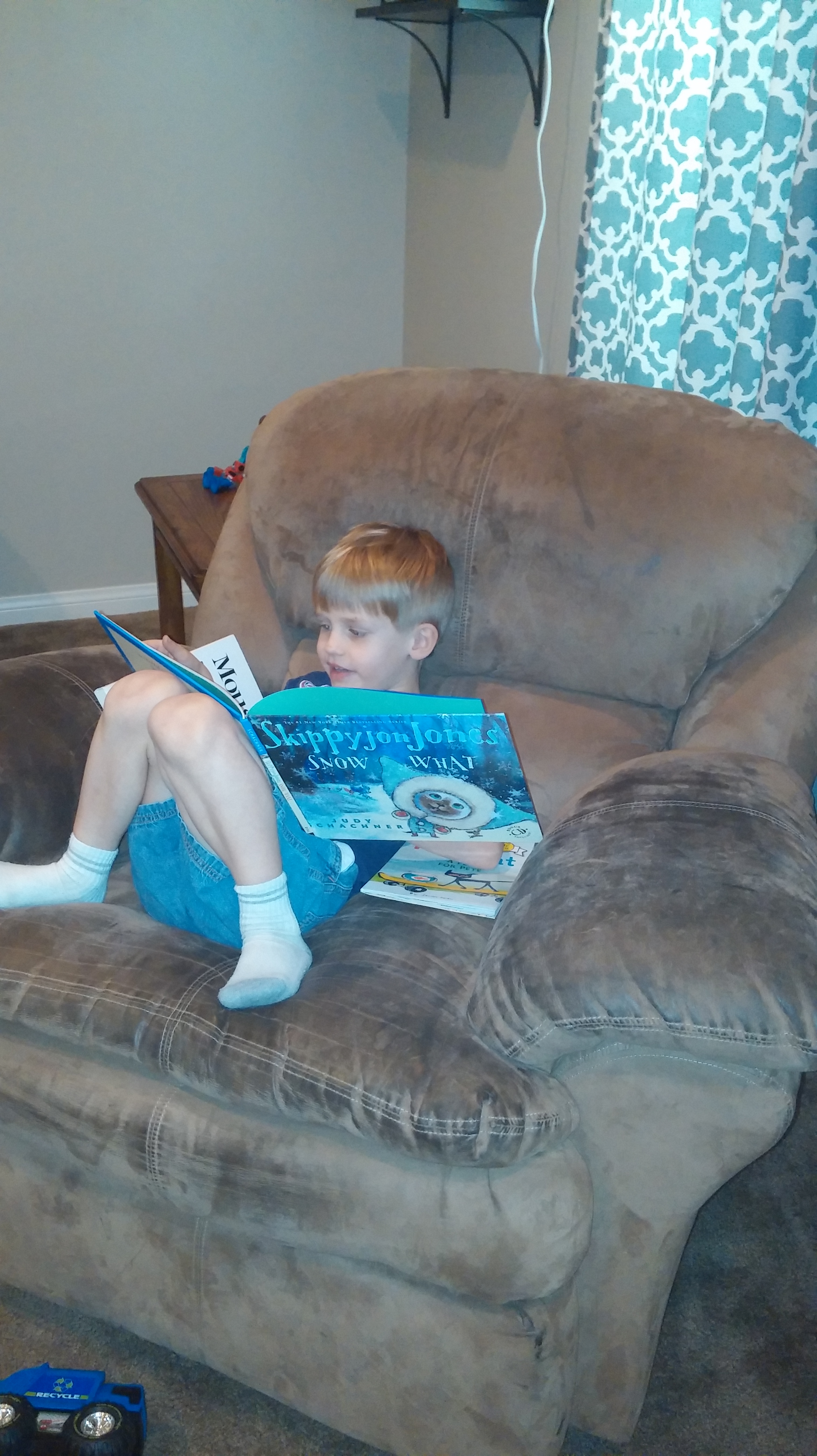 More and more I see Kona taking books from his home library bookshelves to “read”.