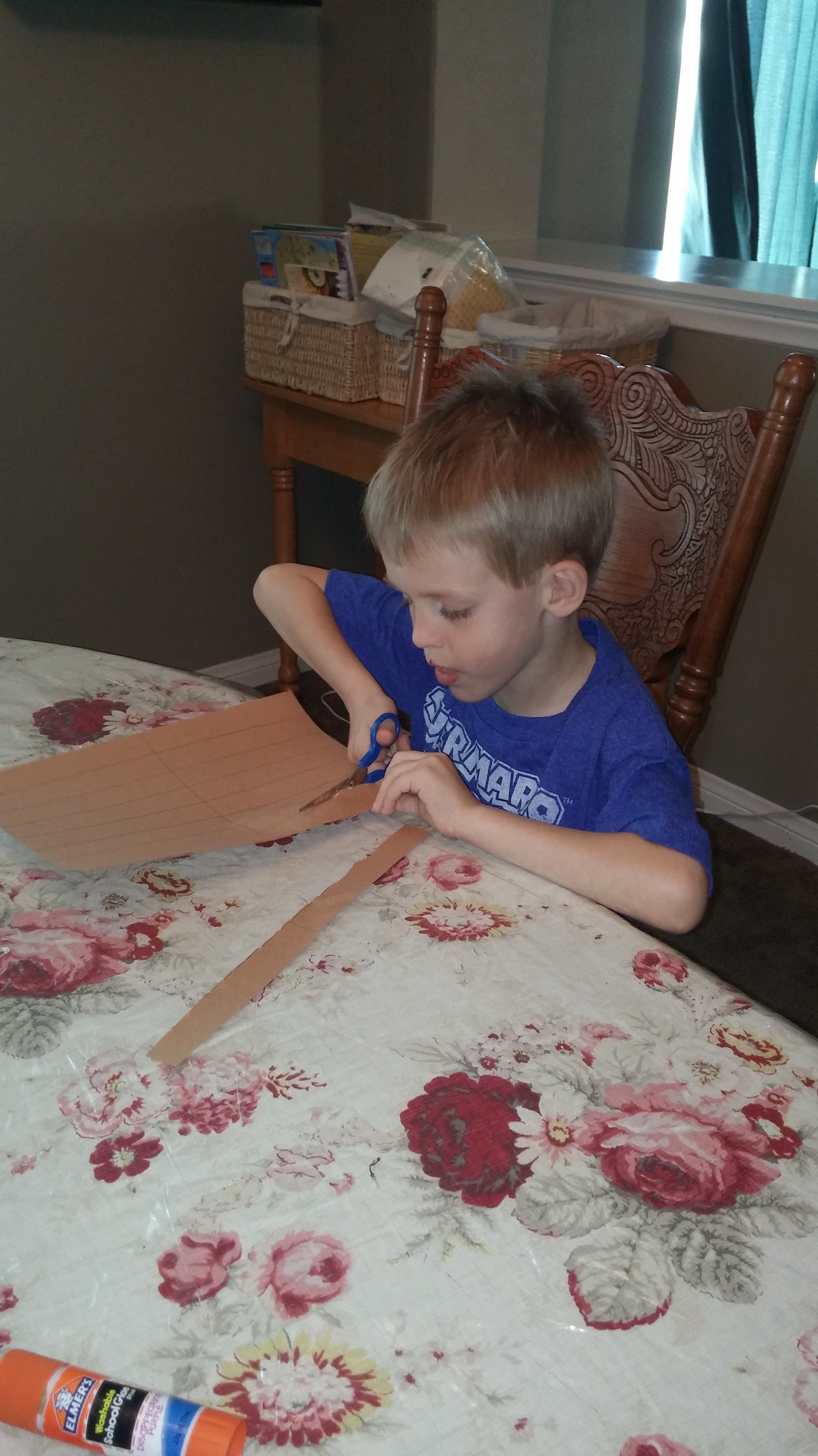 Kona cuts out long rectangles from brown construction paper for the other brothers to use.