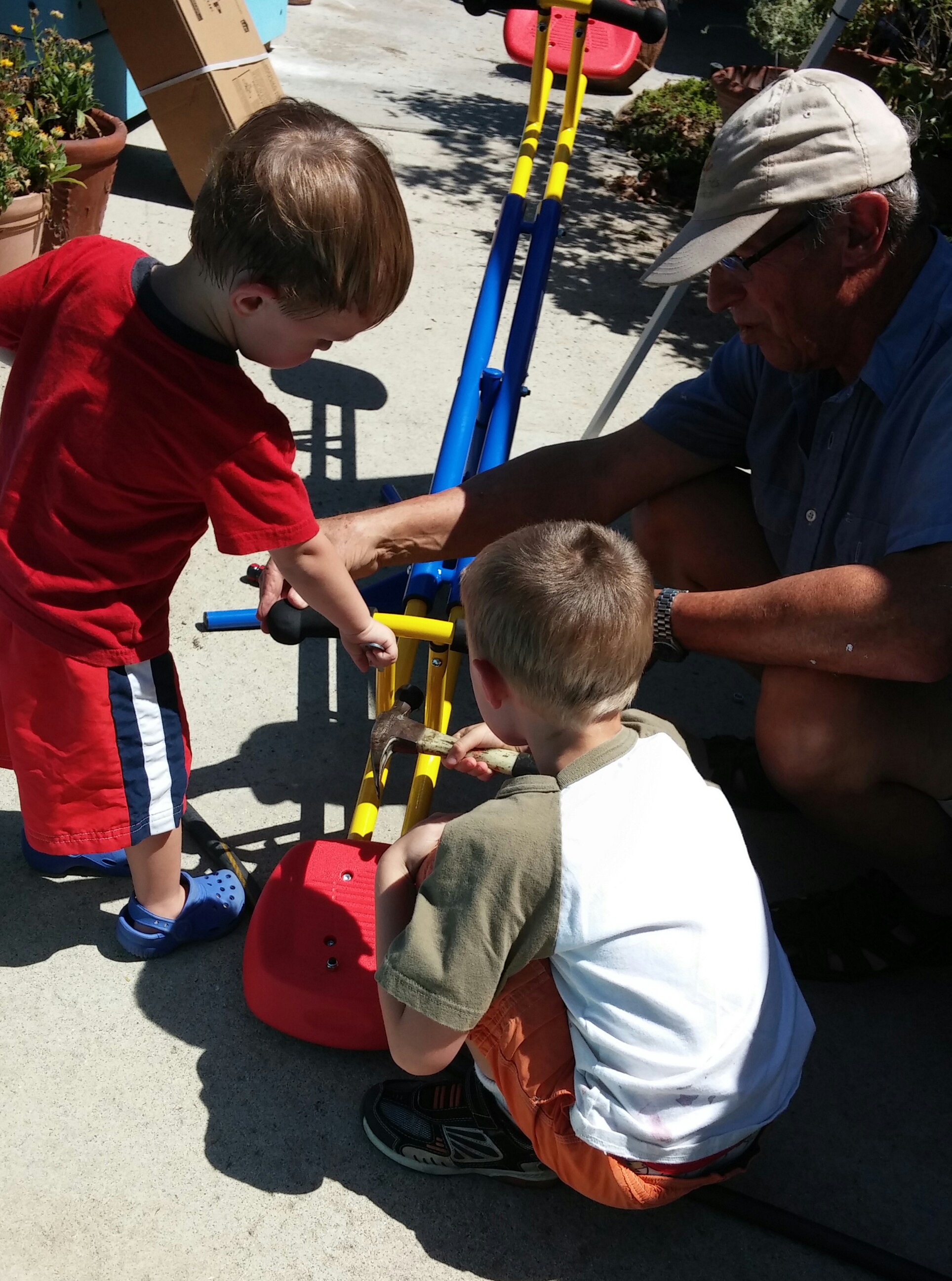 Both Tahoe and his older brother lent Grandpa Jim a helping hand to put together their new seesaw.