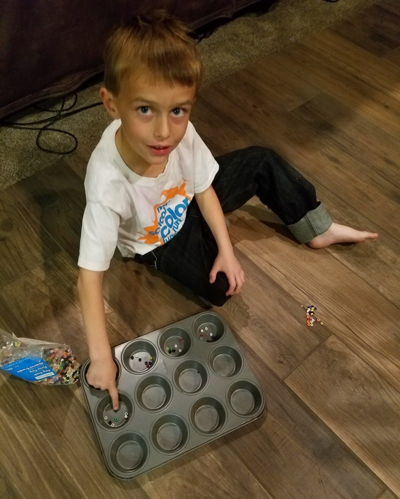 Six year old Tahoe can easily work on arrays using some craft beads and a muffin tin.