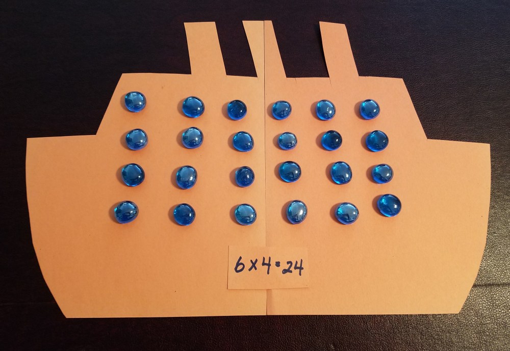 I used flat glass marbles for the arrays in this sample because the grands could reuse the marbles to make more arrays. (Ummm, the orange figure is supposed to represent a cruise ship.)