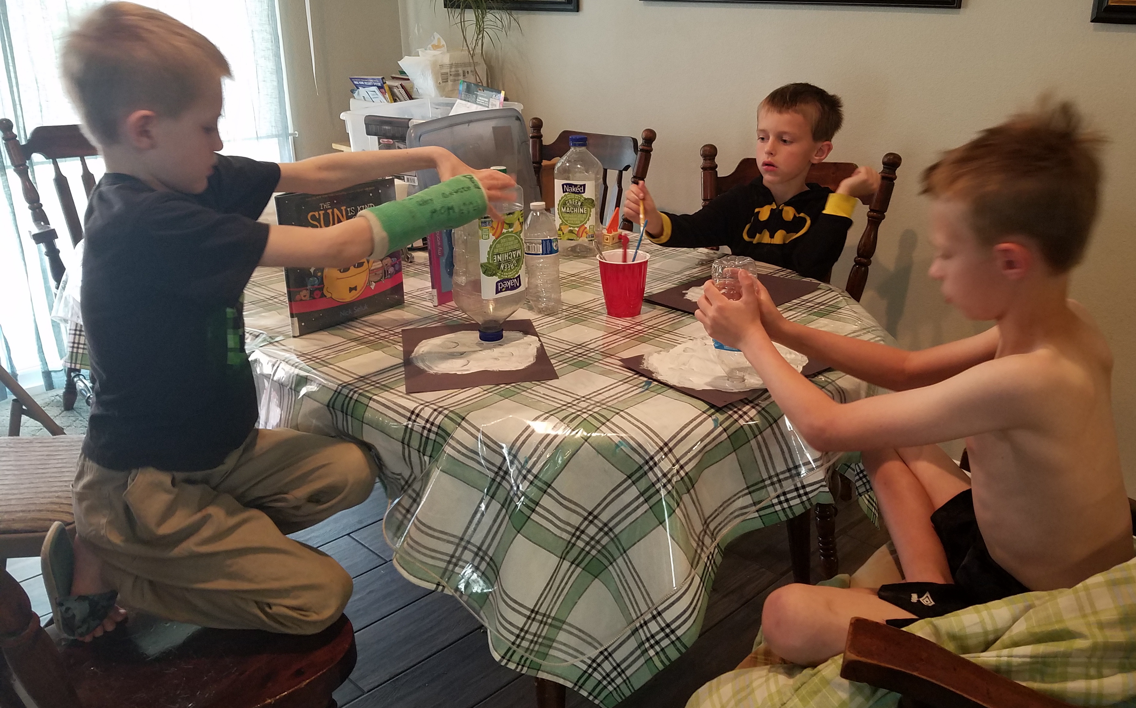 Stamping the caps of water and juice bottles in the white paint mixture.