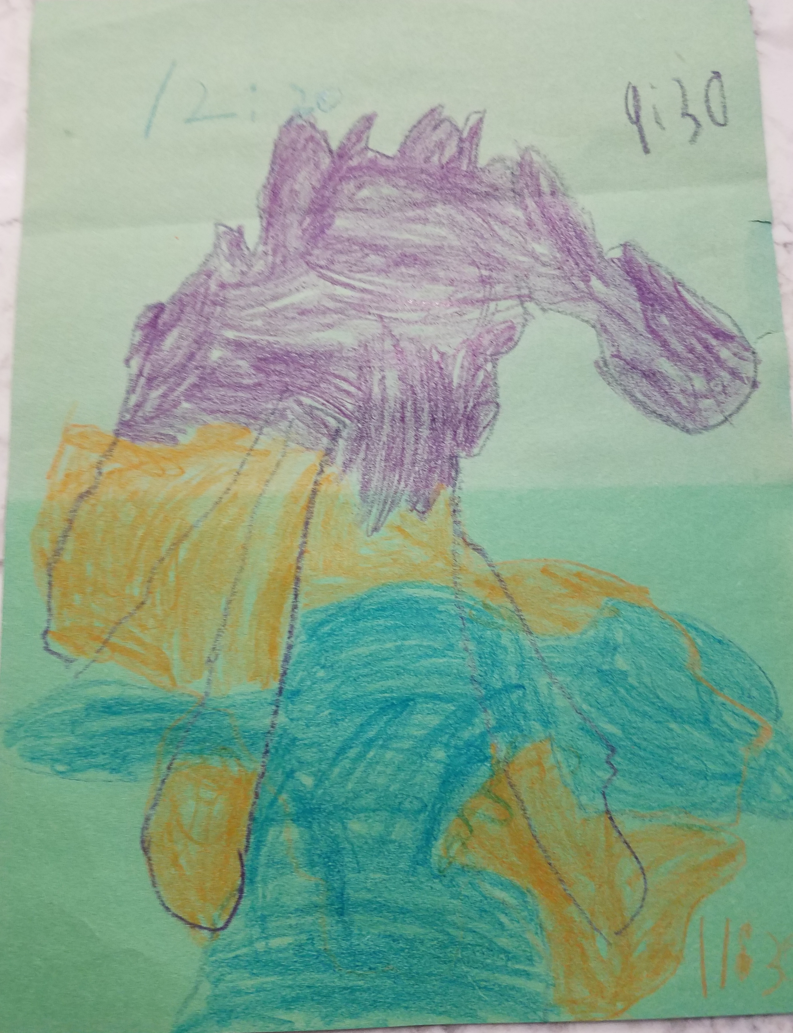 I had him color in the shadows at the end of the day to show the shadow grew smaller throughout the day. the different colors represent 9:30 a.m., 11:30 a.m., and 12:30 p.m.