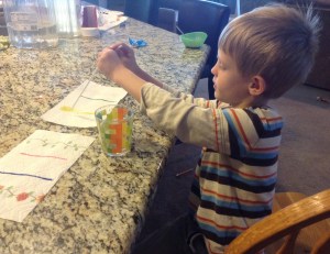 Cooking -I consider cooking to be an interpersonal activity, because the grands still need to work with adult supervision to create the food from the recipes. (When they are older and can read recipes on their own, cooking activities will be more linguistic.) For the letter “W” I found an easy watermelon popsicle recipe, which I adapted to fit into the time frame Kona and I had that day. The basic idea is to cut up enough watermelon to make 5 cups. The cut watermelon is put in the blender with 1/2 cup sugar, pureed, and then poured into a medium sized container to be placed in the freezer for a few hours to become “slushy”. (The puree shouldn’t be frozen at this point.) Then we added a small handful of mini chocolate chips (to look like watermelon seeds) to the watermelon slush and stirred. Lastly, Kona and I poured the concoction into the popsicle molds that I already had on hand. The next day, he got to enjoy his watermelon popsicles.
