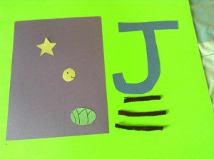 Letter crafts- After reading Stormy Weather and If Frogs Made Weather, I asked the grands for the types of weather mentioned in the books. I used this information to make cut out pictures for a craft project: wind, sun, clouds, rain, snow, fog, and lightning. The grands then glued these cut outs to a letter “W” that I also cut out of construction paper.