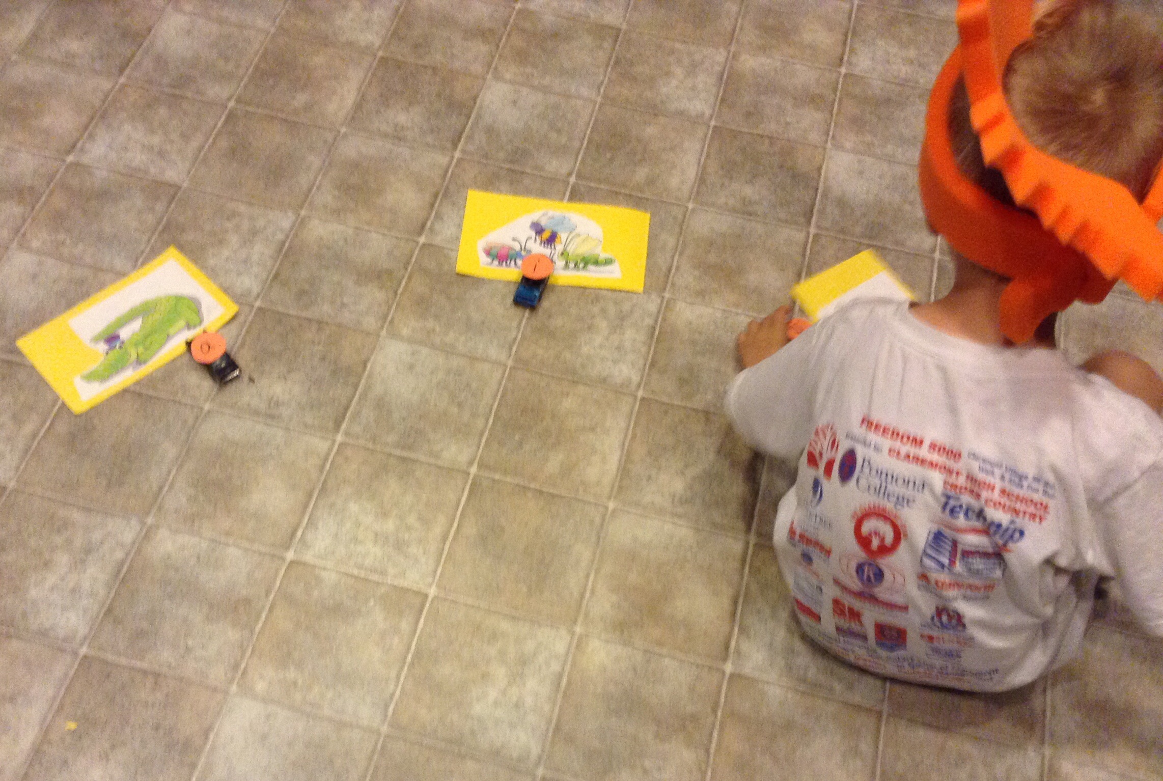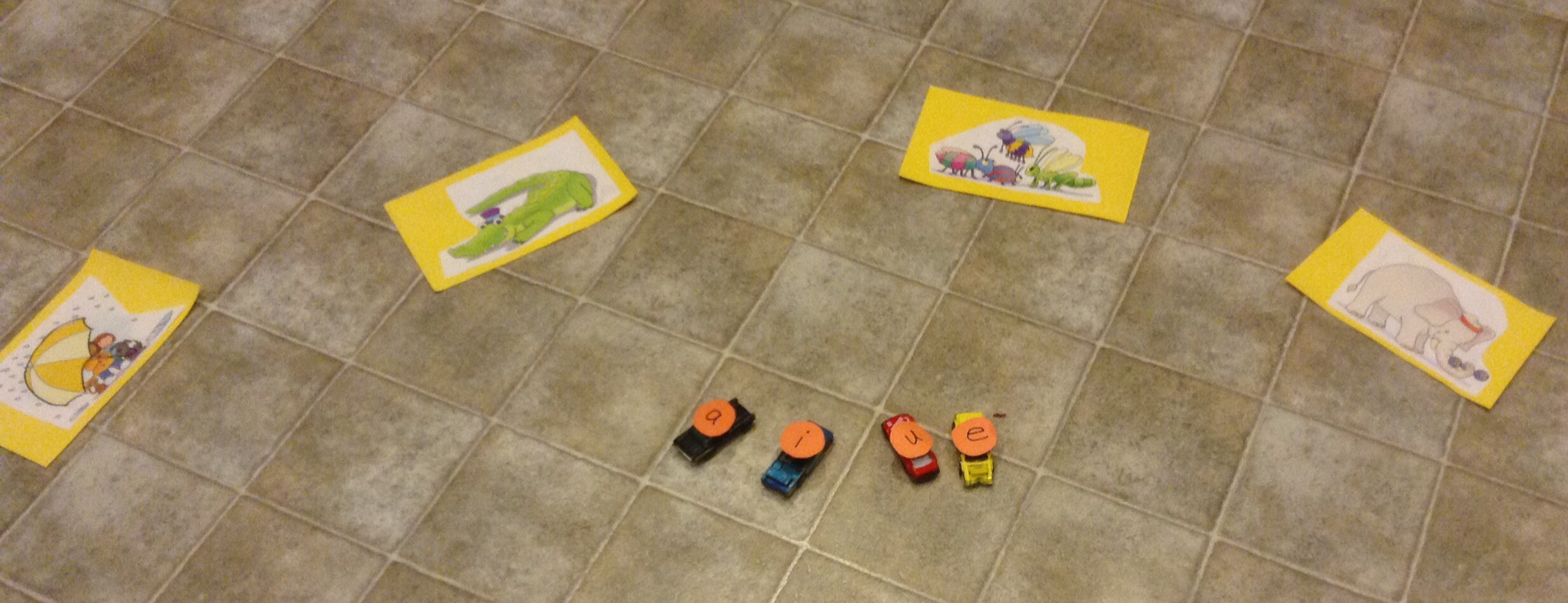 Driving to the Vowel Sound–(Tigger and Kona) I used the picture cards I created from magazines and old workbooks that Tigger had completed. Then I taped a different short vowel letter to the top of the boys’ toy cars. The idea is to have the grands “drive” their short vowel “car” to the pictures that begin with the short vowel sound.